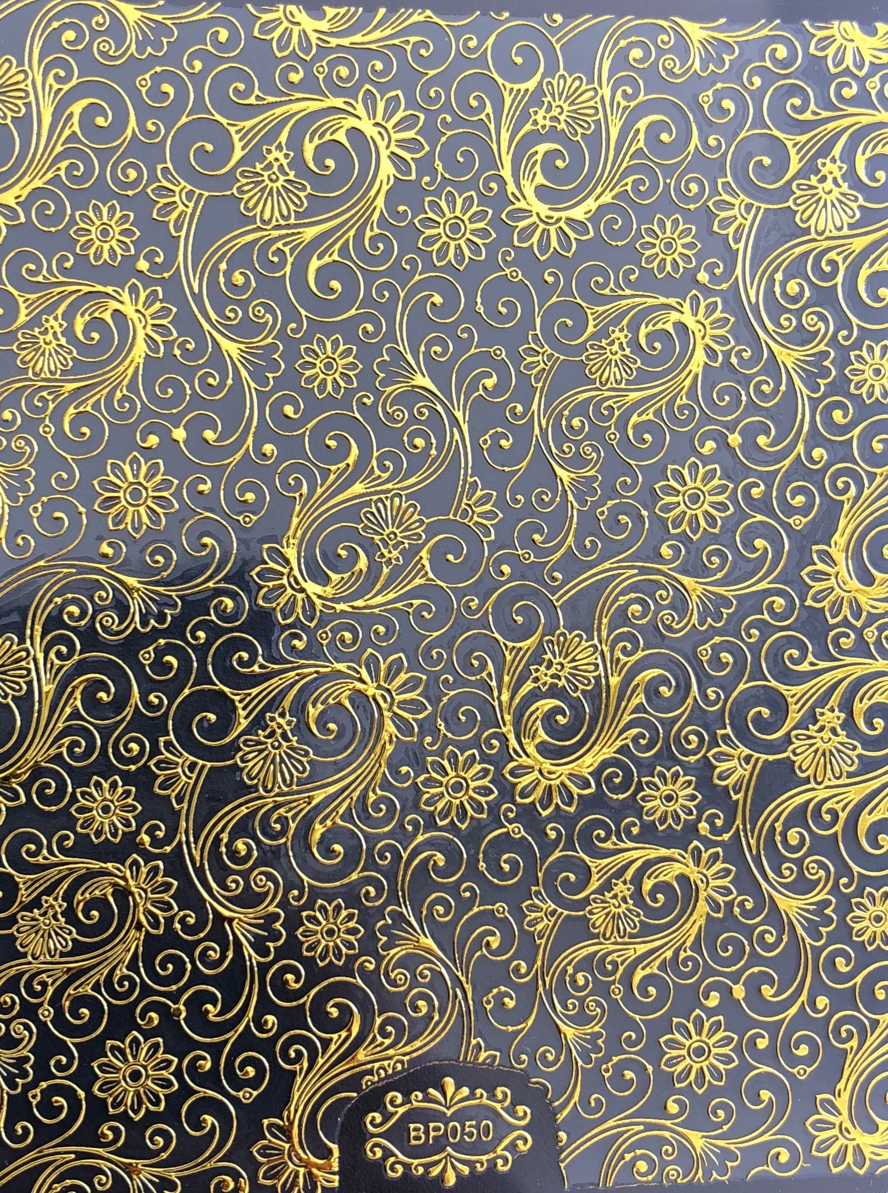 Choose between two styles: 1 Sheet of golden blooming flower design nail sticker or 1 sheet of dancing leaves stickers. Escoge entre dos modelos: 1 hoja de diseño floral en 3D color dorado o 1 hoja de diseño 3D de hojas y espigas.