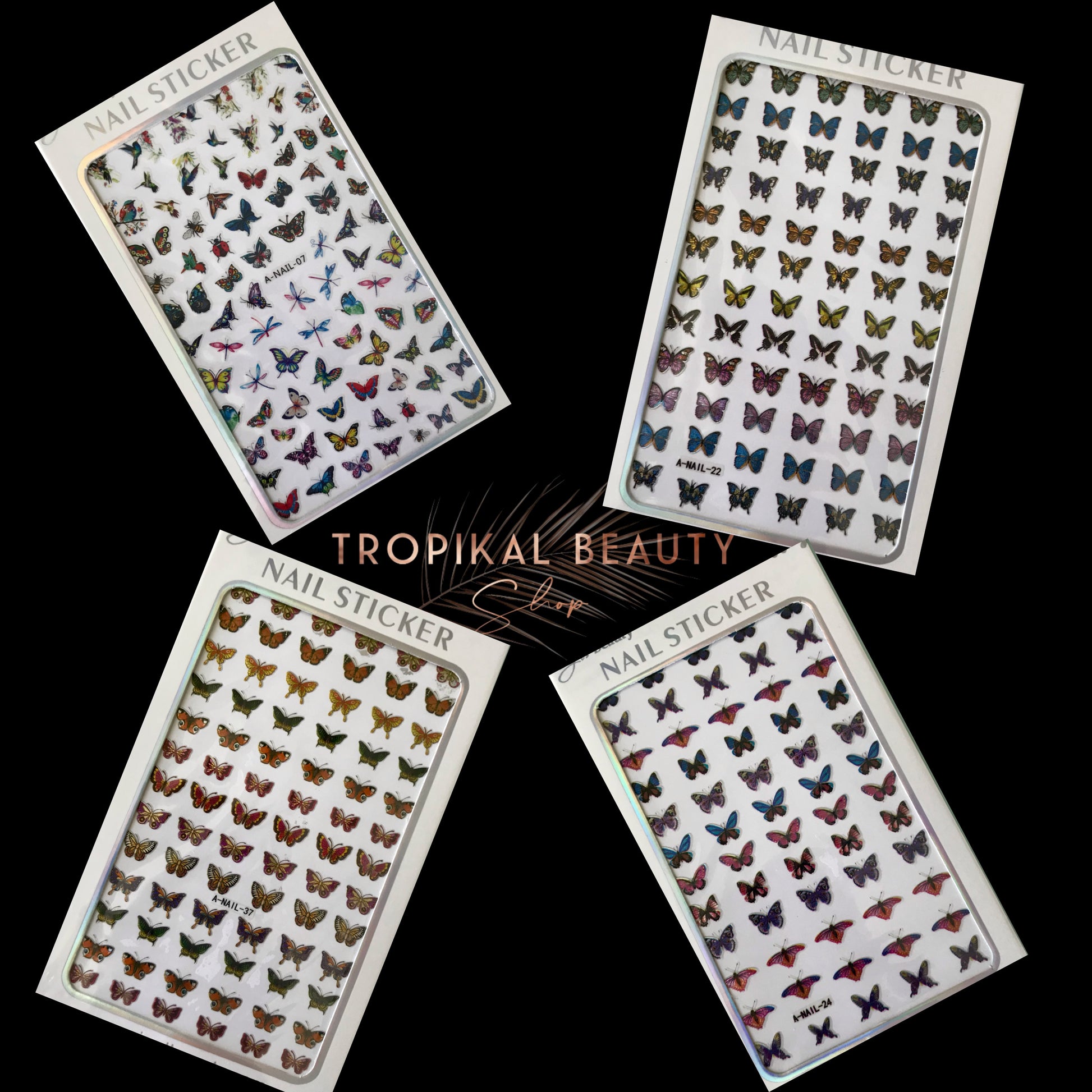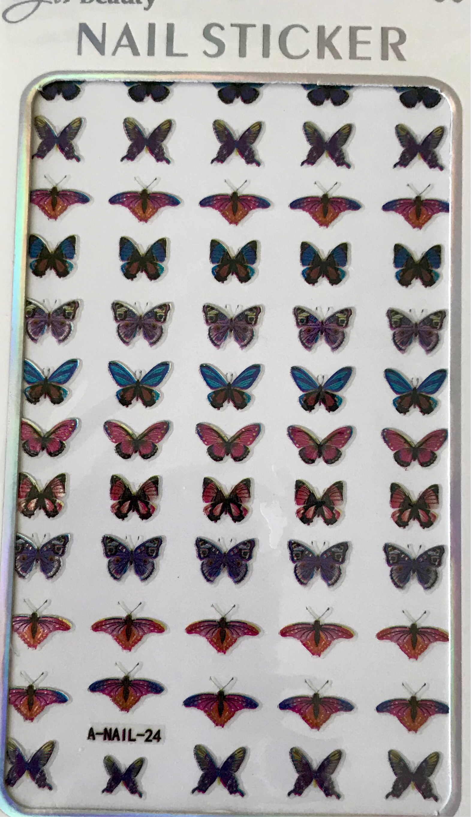 Includes 1 sheet of butterfly nail stickers. Four styles to choose from. Incluye 1 hoja de diseño de mariposas. Cuatro estilos a escoger.