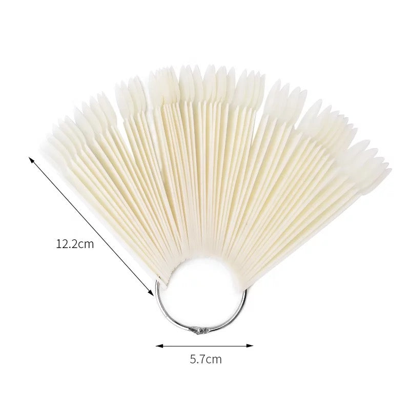 50pcs. Includes metal ring. Ideal for color display or nail art practice. /50 piezas. Incluye anillo metalico. Ideal para exhibicion de colores o para practicar arte en las uñas.